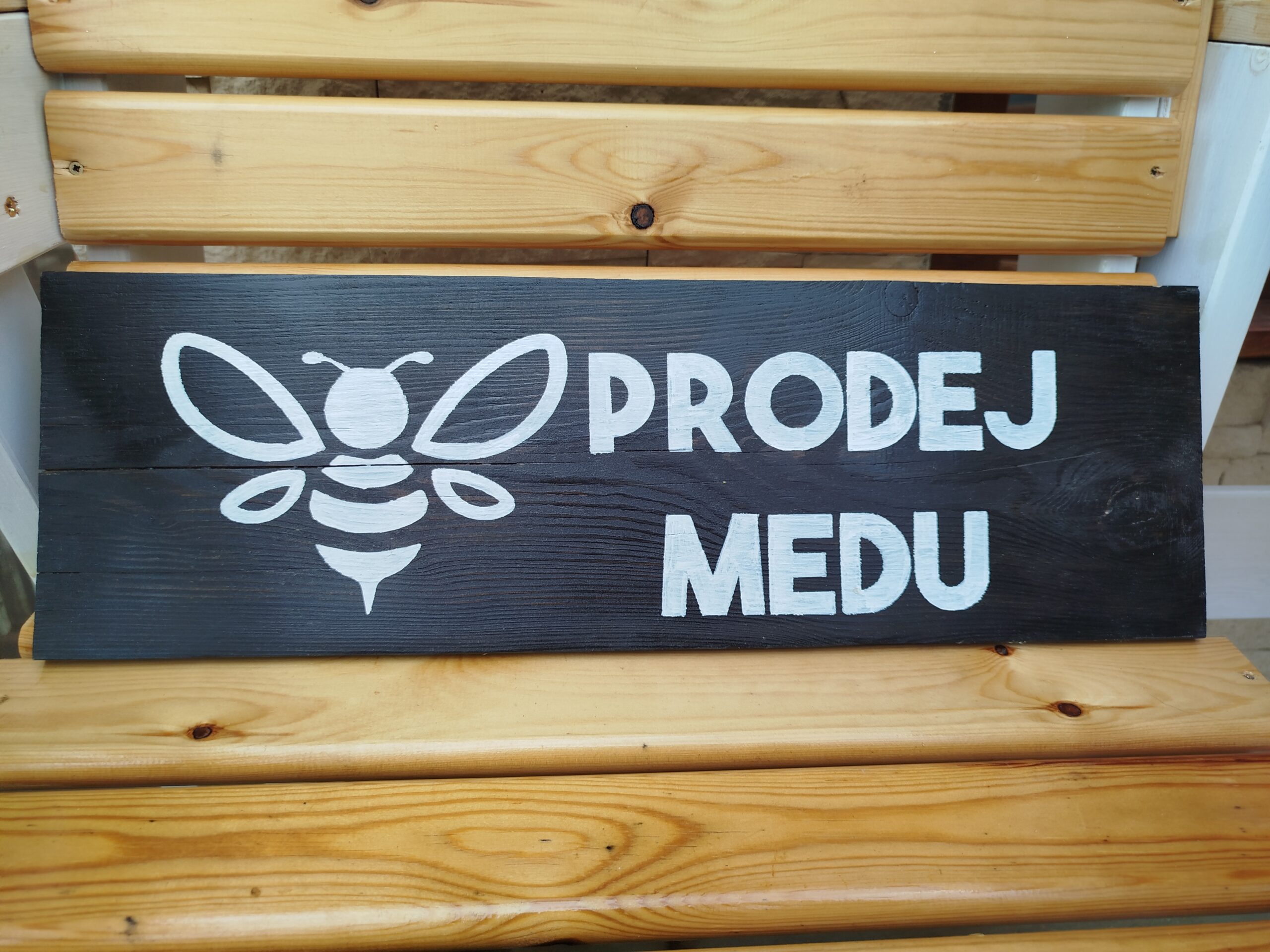 Cedule prodej medu, akrylový nápis na černém dřevěném podkladu. Rozměr 50x 20 cm.