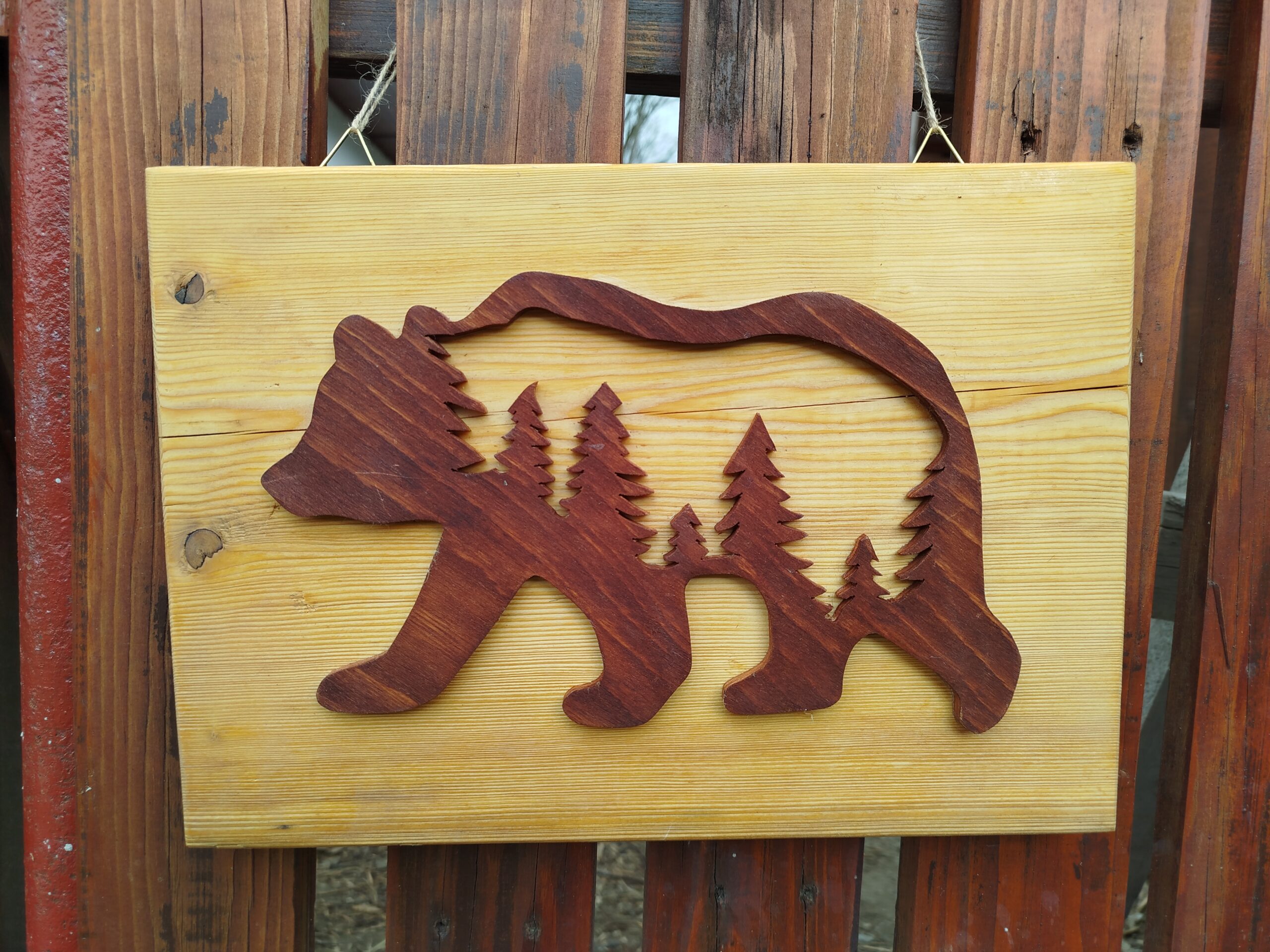Vyřezávaný medvěd z překližky na dřevěném podkladu je originální dekorace, která vnese do vašeho interiéru přírodní atmosféru a rustikální kouzlo. Precizně zpracovaný motiv medvěda zaujme svým detailním provedením a vynikne v každém prostoru.