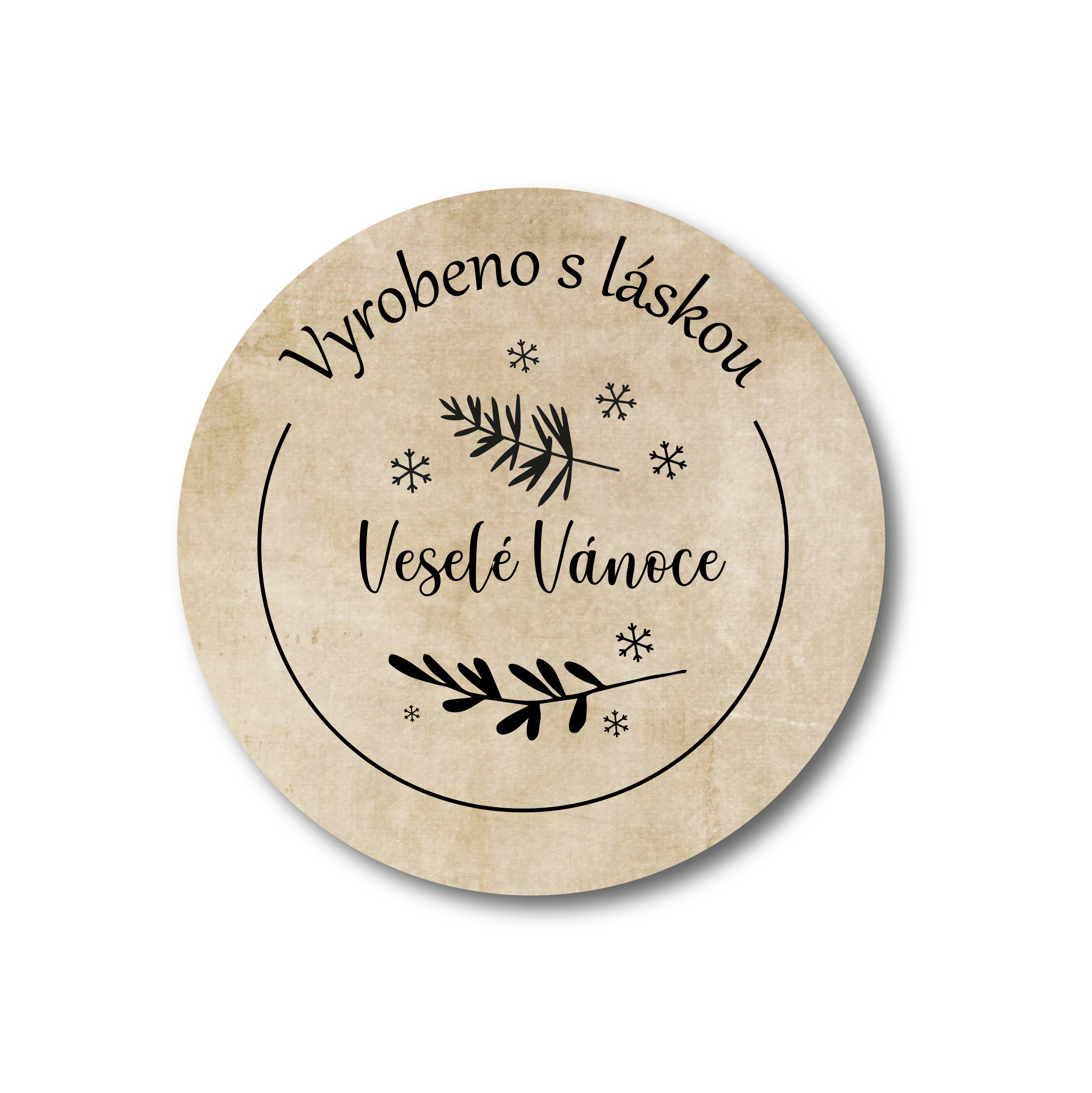 Samolepka – Veselé vánoce, vyrobeno s láskou o velikosti 5 cm, na archu 15 samolepek.