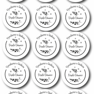 Elegantní kulaté samolepky – Veselé Vánoce, vyrobeno s láskou o průměru 5 cm, ideální pro označení vašich handmade výrobků.