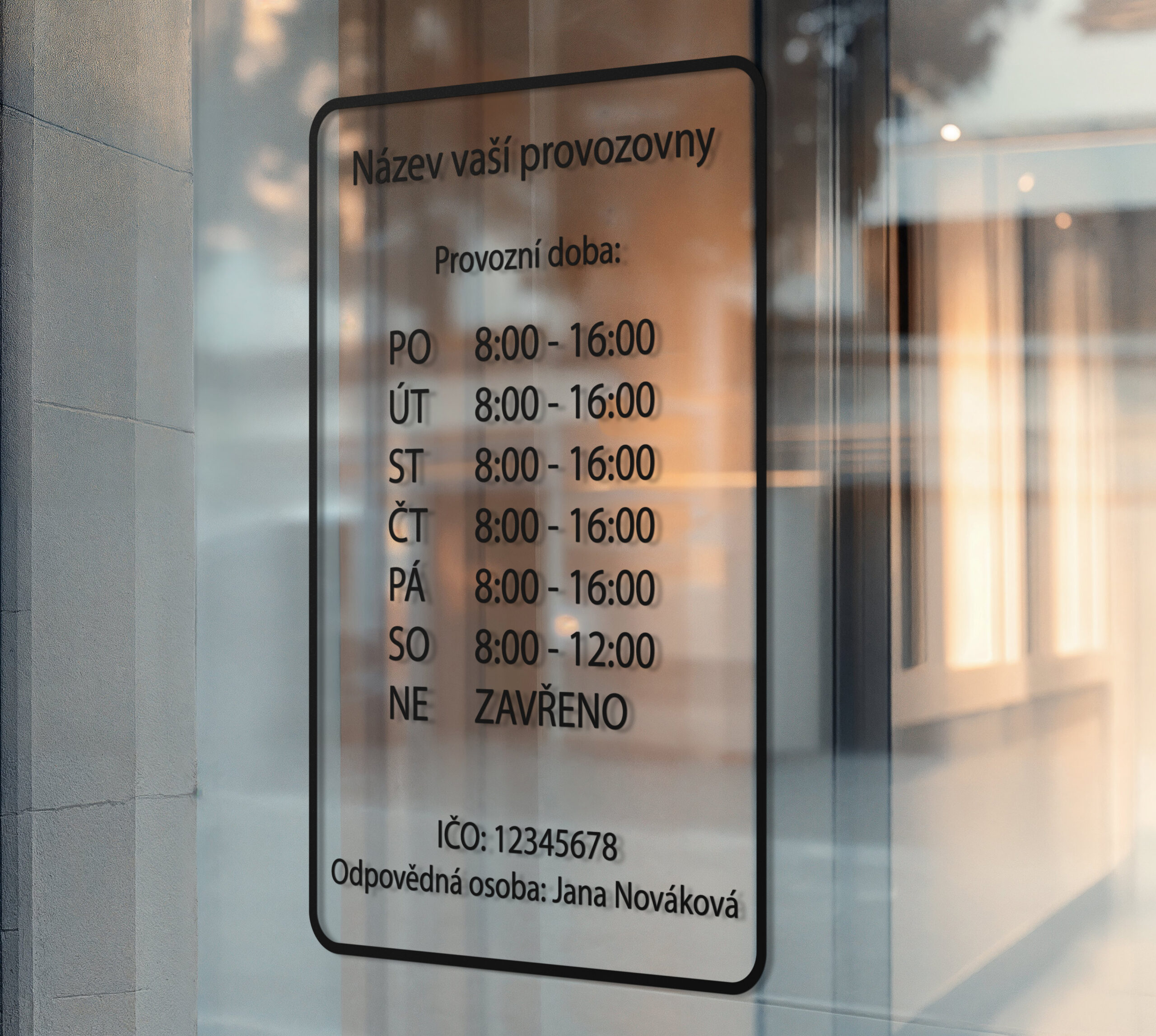Samolepka s provozní dobou pomáhá zákazníkům okamžitě zjistit, kdy je vaše prodejna, kancelář, salon nebo jiná provozovna otevřená. Jasné a profesionální označení vstupu zároveň zvyšuje důvěryhodnost firmy a přispívá k lepší orientaci návštěvníků.