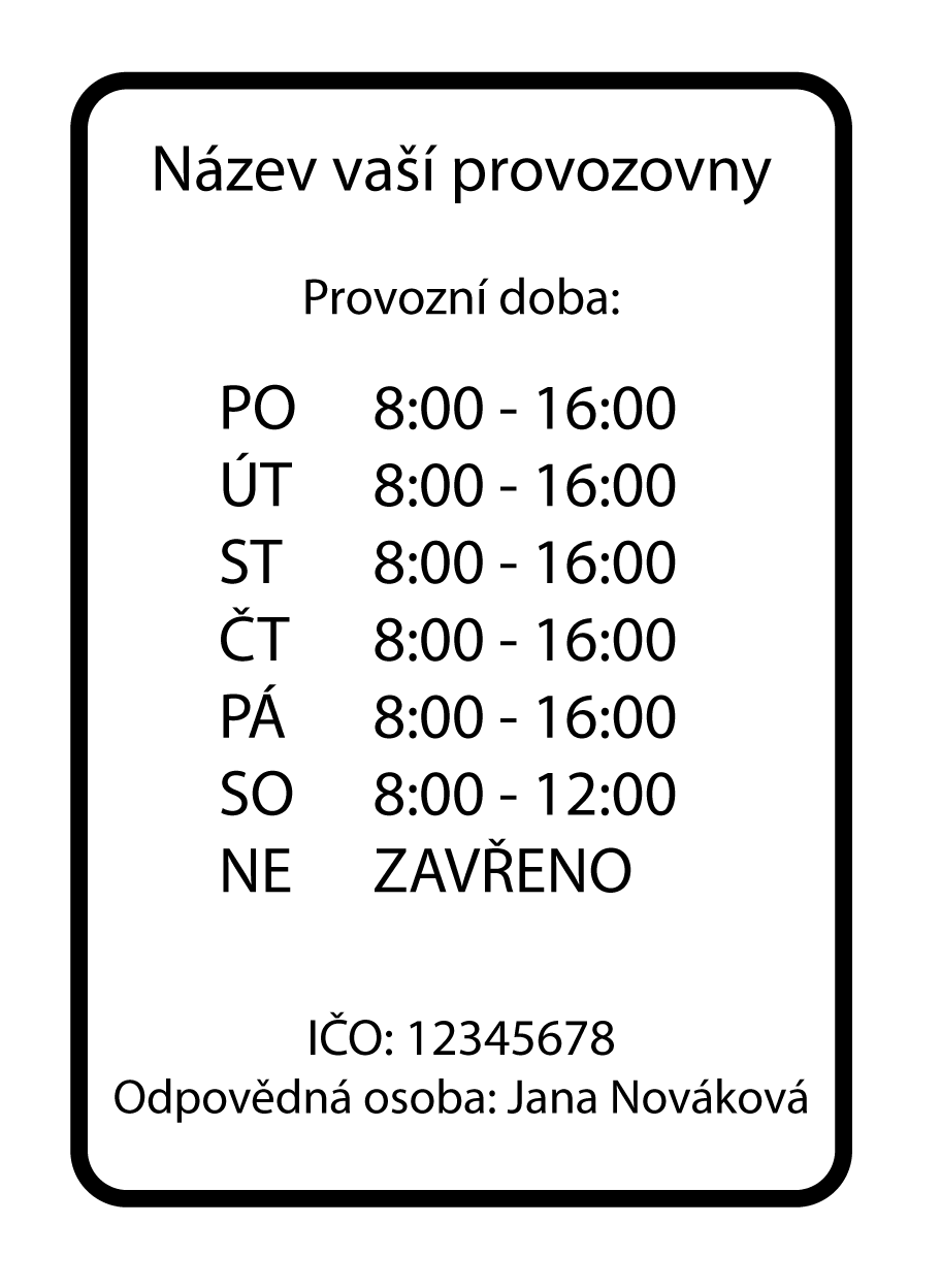 Vinylová samolepka s provozní dobou je jednoduchý a profesionální způsob, jak označit otevírací dobu vaší provozovny. Je vhodná pro nalepení na vstupní dveře, výlohu nebo jiný hladký povrch., velikost A4.